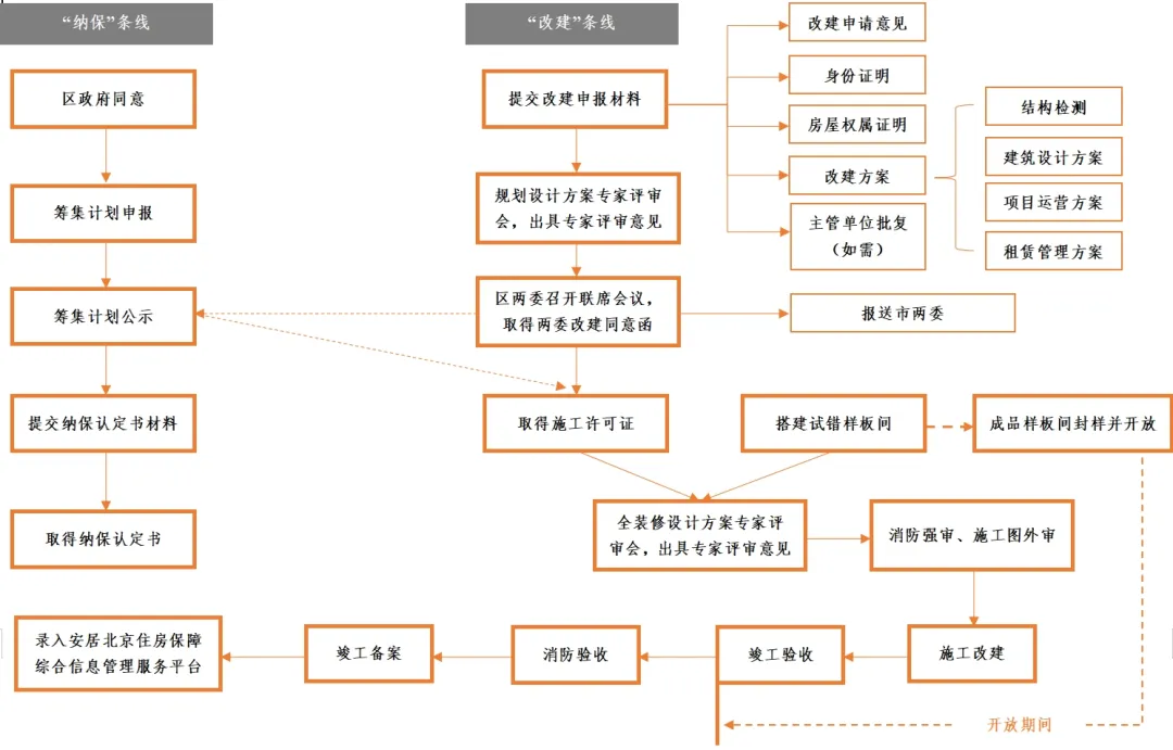 項(xiàng)目的申請(qǐng)和審批有“納保”和“改建”兩種方式:“納保”指經(jīng)政府同意后,項(xiàng)目納入保障性租賃住房年度建設(shè)籌集計(jì)劃,并取得保障性租賃住房項(xiàng)目認(rèn)定書,繼而享受國(guó)家政策優(yōu)惠的過(guò)程;“改建”指實(shí)施主體按照有關(guān)要求將現(xiàn)有存量建筑裝修改建為保障性租賃住房的過(guò)程。流程具體如下圖(以北京市為例):